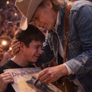 Introduction When Dwight Yoakam Stopped the Show for One Tearful Fan, the Entire Arena Witnessed the Kindness Behind the Legend There are artists who know how to hold a crowd, and then there are artists who know how to hold a moment. Dwight Yoakam has always done both. With his sharp style, restless energy, and unmistakable voice, he built a career that never sounded borrowed from anyone else. He brought edge back into country music without losing its loneliness, its grit, or its emotional truth. That is why “Dwight Yoakam Walked to the Edge of the Stage — And One Fan’s Tears Stopped the Entire Concert” feels so powerful. It is not only a touching story from a live show. It is a reminder that sometimes the most unforgettable moment in an arena is not the loudest one, but the quietest. For decades, Dwight Yoakam has represented something rare in country music: authenticity with style. He could be cool without seeming distant, traditional without sounding old-fashioned, and emotionally precise without ever forcing the point. His songs have always lived in a world of heartbreak, highways, smoky rooms, and stubborn memory. Fans do not simply listen to Dwight Yoakam. They carry him with them through years of living. His music belongs to long drives, solitary evenings, and the private resilience that older listeners understand well. It speaks to people who know that real feeling does not need to shout. That deeper connection is what makes “Dwight Yoakam Walked to the Edge of the Stage — And One Fan’s Tears Stopped the Entire Concert” resonate so strongly. In the middle of a roaring performance, when the arena is alive with boots, guitars, applause, and shared nostalgia, Dwight notices one young fan near the front. That detail alone matters. In a sea of faces, he sees one person. The fan is trembling, holding a faded vinyl record that appears older than he is — a beautiful image in itself, because it suggests inheritance, loyalty, and the passing of music from one generation to the next. Then Dwight slows. He raises his hand. The band falls silent. That gesture transforms the atmosphere instantly. The concert stops being only a performance and becomes something far more human. As he walks to the edge of the stage, the entire arena understands that they are witnessing not a stunt, but a real act of attention. He leans down, speaks quietly to the fan, signs the record, and offers a gentle hug. It lasts less than a minute, yet emotionally it carries extraordinary weight. Why? Because it reveals something that fans always hope is true about the artists they love: that behind the image, behind the legend, there is still a person capable of simple kindness. What makes the moment so moving is not only what Dwight does, but how naturally it fits the emotional world of his music. His songs have long understood wounded hearts, lonely roads, and the quiet ache people carry without saying much about it. So when he pauses the concert for one fan’s tears, it feels like the values inside the songs have stepped off the record and into real life. That is why “Dwight Yoakam Walked to the Edge of the Stage — And One Fan’s Tears Stopped the Entire Concert” stays with the imagination. It is not just about a signed album or a brief embrace. It is about recognition. It is about a fan feeling seen, and an arena being reminded that great music is not only measured in applause. Sometimes its true power is found in a pause, a gesture, and a moment of compassion that no one in the room will ever forget.