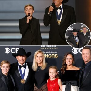 đźđ George Strait turned the Kennedy Center Honors into a family milestone when his grandson Harvey joined him on stage â surprising guests and bringing the room to its feet. After being introduced as an honoree, Strait smiled, motioned to Harvey, and whispered, âCome sing it with me.â â Together, the two performed âGod and Country Music,â with Harvey singing the opening lines in a soft, steady voice that made the entire audience fall silent. Then, in a moment no one saw coming, Strait transitioned into âTroubadour,â letting Harvey finish the final chorus beside him. By the time the last note faded, the crowd was already standing â some cheering, some wiping tears â as George pulled his grandson close and said with a proud smile: